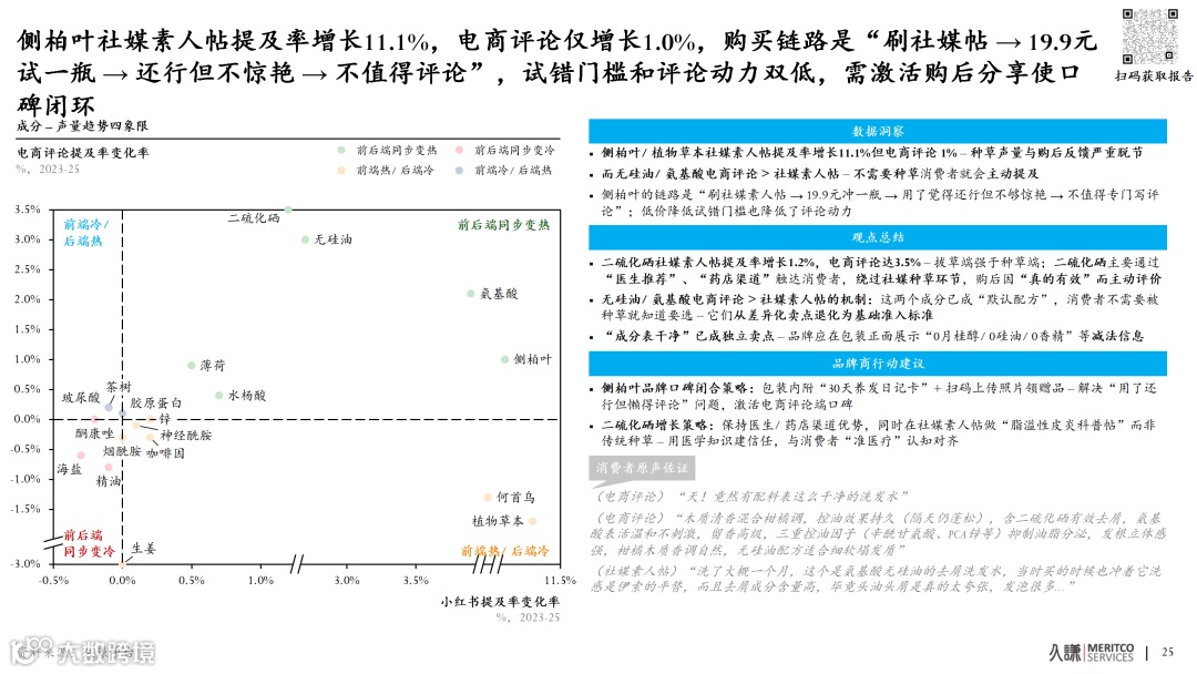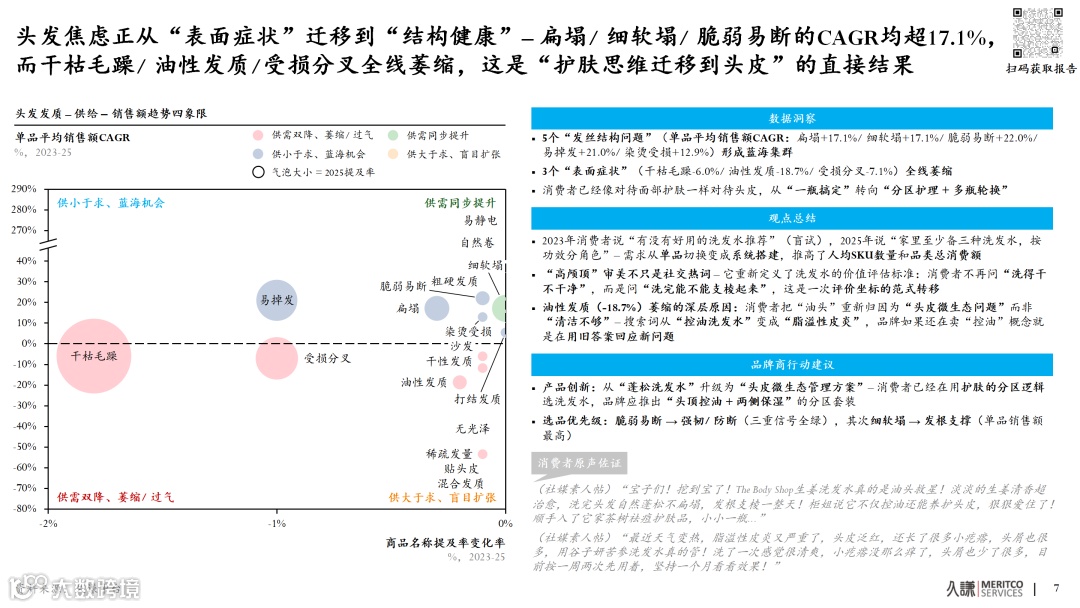 发丝结构问题(扁塌、脆弱易断)高增长与干枯毛躁等表面症状的萎缩形成对比。提前捕捉该信号,能比竞品抢占完整研发周期,建立效率壁垒。