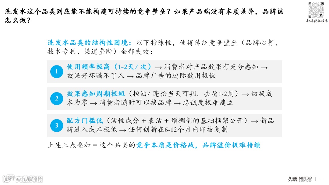 洗发水使用频率高(1-2天一次),消费者效果感知强且频繁,广告难以建立忠诚度;基础配方公开透明,创新易被快速复制;渠道进入门槛低,且控油、蓬松等功能效果感知周期极短,切换成本极低。四重因素叠加,行业竞争本质已退化为价格战。