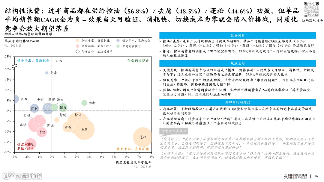 行业数据显示,超半数品牌供给资源集中于控油、去屑、蓬松三大红海功效,但其单品平均销售额年复合增长率均为负值。核心问题在于缺乏认知效率差——企业沿用“品类大即铺量”旧逻辑,导致同质化竞争加剧。