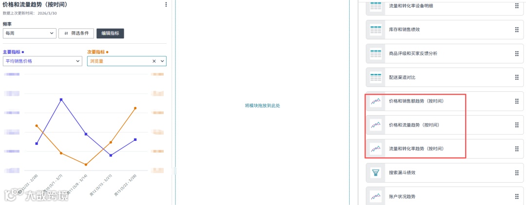 在页面左侧找到:整体业务绩效,点击页面右侧建立副本,然后点击添加一个板块,找打设备流量和转化率趋势添加进入板块即可查看