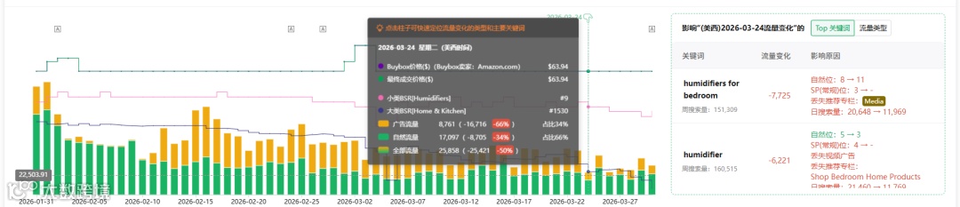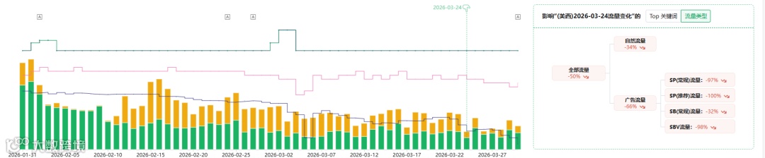如图所示,在反查流量词的搜索框中输入ASIN后,可以发现流量柱状图最短的是3/24号,这里可以看到广告流量(黄色),自然流量(绿色)相对前面几天而言都是最低的,当我们点击3/24的柱子后,会发现在右侧出现关于3/24号的流量类型分析,我们可以明确看到在这一天广告和自然流量双双下跌,广告下跌最为严重-66%,自然流量下降-34%。