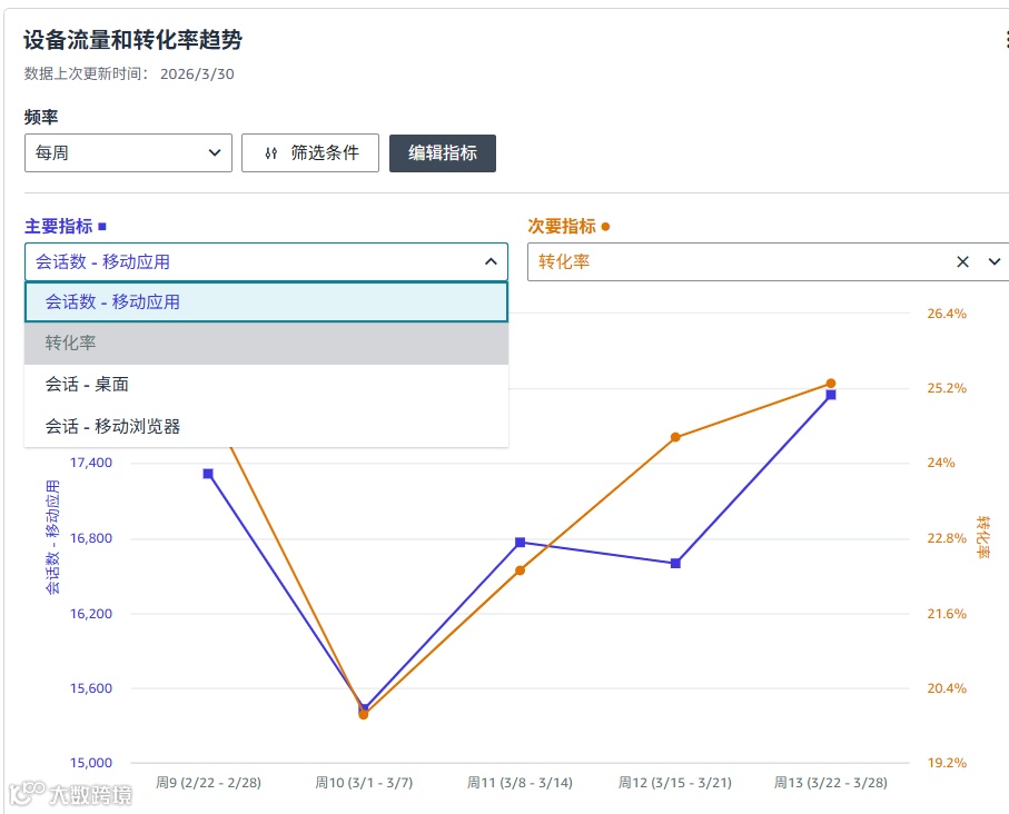 另外我们可以考虑将设备流量与转化率加入到分析项中,如图所示,我们可以查看移动端和PC端会话与转化率的趋势,来判断是那一部分的转化率下降了,是手机用户不买,还是电脑用户不买,针对性优化图片 / 排版。