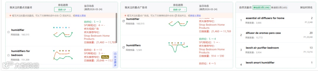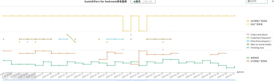 切换到TOP关键词就可以发现,humidifiers for bedroom广告位丢失,自然为也从第8位下降到11位。这一步做完,基本就能确定:是哪个关键词、哪一天、哪种流量开始崩的。