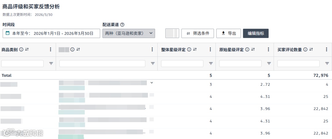 在页面左侧找到:整体业务绩效,找到商品评级和买家反馈分析版面,如果没有原始星级评定可以点击黑色的编辑指标按钮进行添加