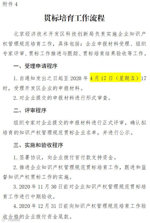 为更好发挥知识产权在北京建设全国科技创新中心的支撑作用,加快促进北京经济技术开发区知识产权发展,提升开发区企业知识产权管理水平,引导企业建立科学、系统、规范的知识产权管理体系,经研究决定,现开展2020年企业知识产权管理规范贯标培育及支持工作,有关事项通知如下。