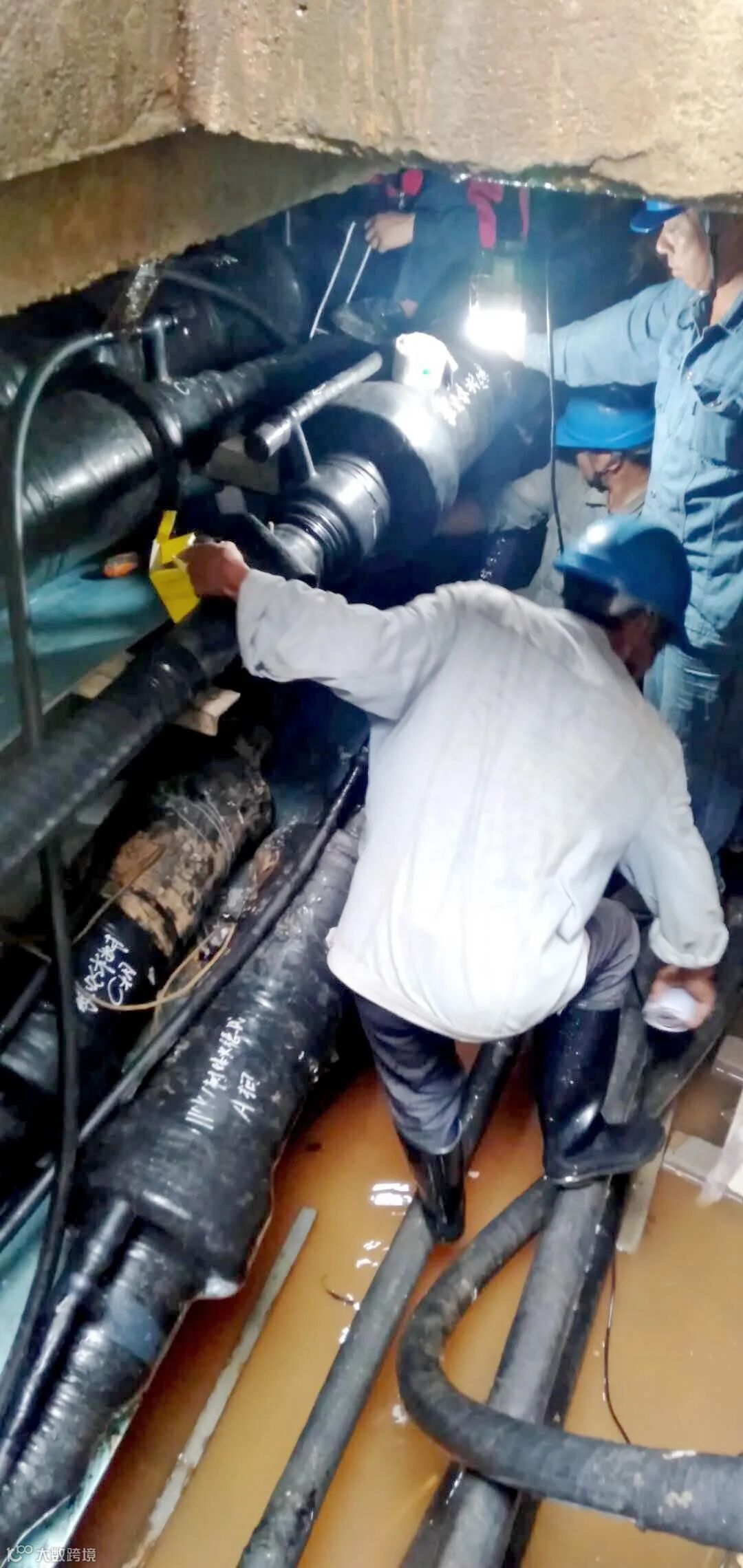 110千伏黎火体树线抢修现场,一处低矮、幽暗的电井内一盏白炽灯晃晃悠悠,星宇公司共产党员服务队的队员们正弓着腰在进行电缆头制作。