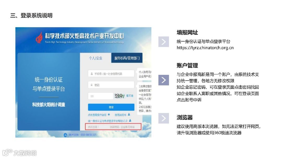 (一)火炬系统统一身份认证与单点登录平台,登录网址:https://tyrz.chinatorch.org.cn/hjismp/a/login#tj。