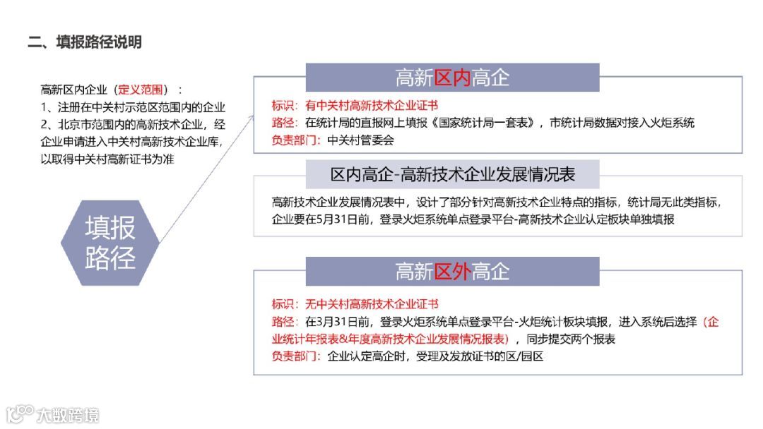 依据国家统计局发布的《北京市中关村国家自主创新示范区统计报表制度》,取得了中关村高新技术企业证书的企业,通过北京统计联网直报系统报送数据,不需要单独填报火炬统计年报。企业须在2020年5月31日前登录火炬系统统一身份认证与单点登录平台,进入高新技术企业认定板块,填写并提交《高新技术企业年度发展情况报表》。