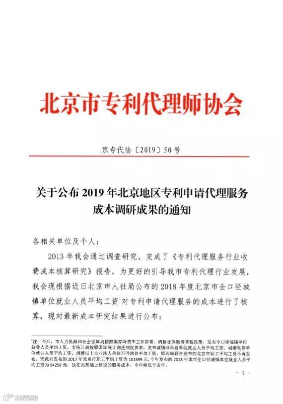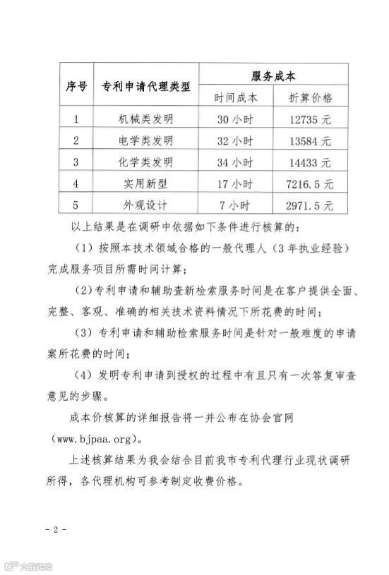 各相关单位及个人: 2013年我会通过调查研究,完成了《专利代理服务行业收费成本核算研究》报告,为更好的引导我市专利代理行业发展,我会现根据近日北京市人社局公布的2018年度北京市全口径城镇单位就业人员平均工资[1]对专利申请代理服务的成本进行了核算,现对最新成本研究结果进行公布:
