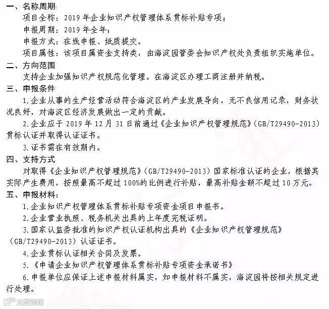 导读:海淀区2019年企业知识产权管理体系贯标补贴专项