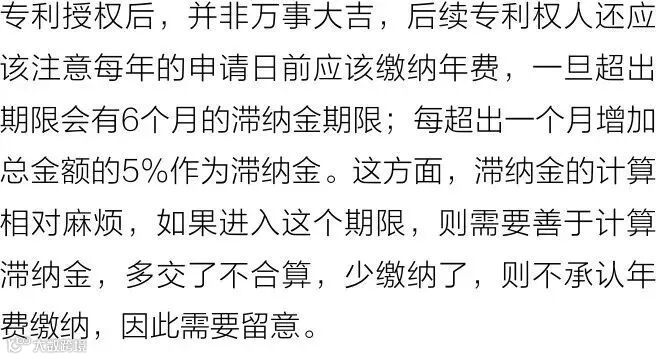 专利授权后,并非一劳永逸,后续专利权人还应该注意每年的申请日前及时缴纳年费,一旦超出期限会有6个月的滞纳金期限。这个期限就是等滞纳金期限,每超过一月需要缴纳当年年费的5%费用。