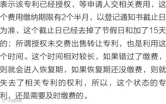 表示该专利已经授权,等申请人交相关费用。这个期限就是所谓的授权未交费专利转让状态,也是专利转让变更的最佳期间,可以变更证书上的名字,但是因为这个期限相对较短,也造成这种专利的珍贵程度。