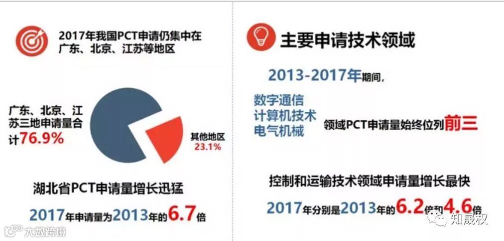 地域分布方面,2017年我国PCT申请仍集中在广东、北京、江苏等地区,广东、北京、江苏三地申请量合计高达76.9%。湖北省PCT申请量增长迅猛,2017年申请量为2013年的6.7倍。