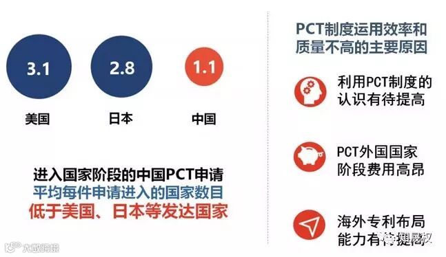 (一)我国申请人在PCT制度运用方面的效率和质量还有提升空间相对发达国家而言,中国PCT申请人的制度运用效率还不够高。2014年,我国平均每件PCT申请进入国家阶段的国家数目为1.1个,还低于美国(3.1个)、日本(2.8个)等发达国家的水平。还存在个别申请人PCT申请进入国家阶段比例明显偏低的情况。调查分析,造成我国申请人PCT制度运用效率和质量不高的主要原因包括:一是一些申请人利用PCT制度的认识有待提高。部分申请人提交PCT申请的目的仅停留在企业宣传、产品推广、获得政策支持层面,缺乏进入国家阶段获权程序的动力。二是PCT外国国家阶段费用较高。中小型创新主体对于国家阶段的费用更为敏感,进入发达国家的国家阶段支出成为其PCT申请能否进入国家阶段的主要考虑因素。三是创新主体海外专利布局的能力有待提高。问卷调查显示,超过一半的企业表示不熟悉相关国家的PCT法律制度和程序规则,成为PCT申请进入国家阶段的业务障碍。