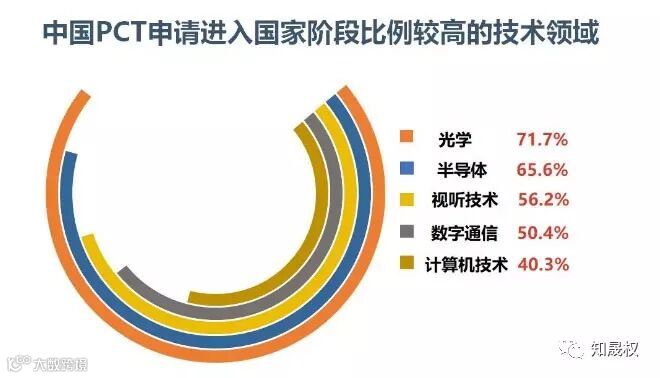 中国PCT申请进入PCT国家阶段比例较高的领域是光学、半导体、视听技术、数字通信、计算机技术领域。其中,光学、半导体、视听技术和数字通信领域的进入比例超过50%,光学领域更是达到71.7%。