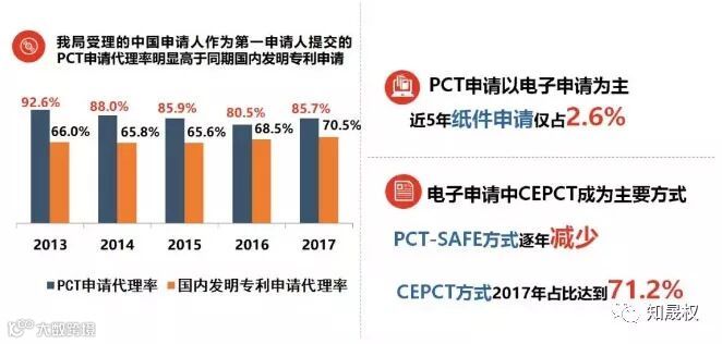 PCT申请以电子申请为主,近5年纸件申请仅占2.6%;电子申请中PCT-SAFE方式逐年减少,CEPCT成为电子申请主要方式,2017年占比达到71.2%。