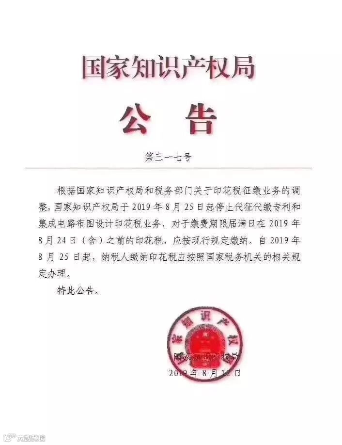 1.缴费截止日在2019年8月25日以后的专利,不再由国家知识产权局代缴印花税费。