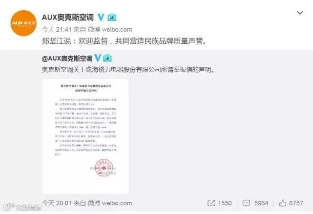 就在格力亮出8份检验报告8分钟后,奥克斯官微再次转发此前关于格力举报信的声明称,“郑坚江说:欢迎监督,共同营造民族品牌质量声誉。”据悉,郑坚江为奥克斯集团董事长。