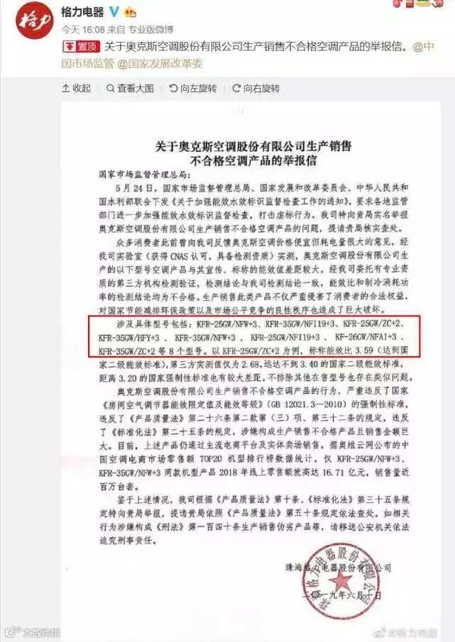 6月10日下午,格力在官方微博置顶发布关于奥克斯空调股份有限公司生产销售不合格空调产品的举报信,并@了国家市场监管总局和国家发改委的官方微博。格力在举报信中称,奥克斯空调股份有限公司生产的8个型号空调产品与其宣传、标称的能效值差距较大,能效比和制冷消耗功率的检测结论均为不合格。