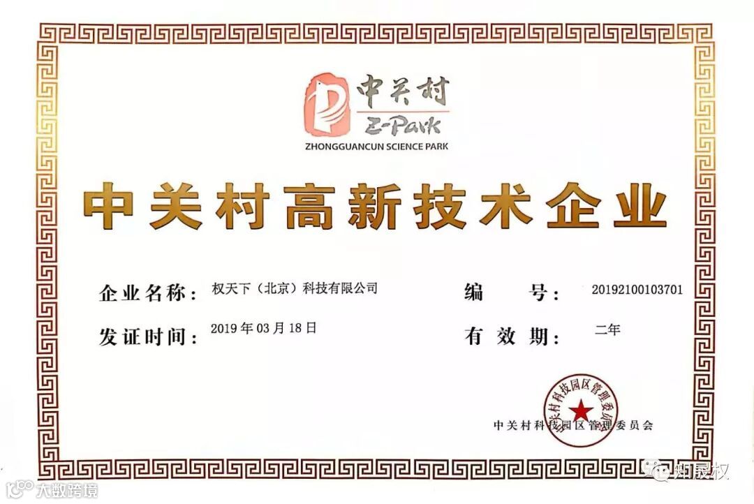 2019年3月18日,权天下(北京)科技有限公司获得中关村科技园区管理委员会颁发的中关村高新技术企业证书。这是权天下公司成立八个月以来获得的第三项荣誉。