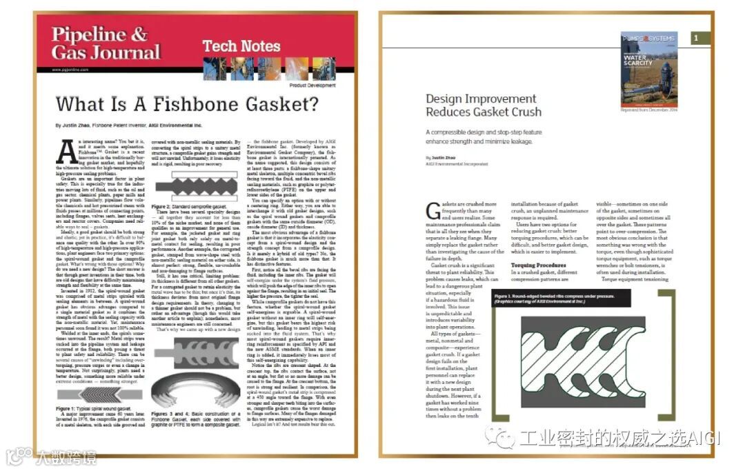 AIGI品牌鱼骨垫是由艾志工业自主研发,并且获得国内外专利的一项革新技术。众所周知,垫片密封一直都是工业安全、环保生产的关键。传统垫片在载荷力过大或者系统工况波动下存在着严重的不足,AIGI品牌鱼骨垫通过创新设计,极大地降低了密封泄漏率,显著地提高了生产、环境和人员健康方面的安全保障,为极端环境下更可靠、更牢固的密封问题提供了新的解决方案。该技术的相关论文于2014年9月在美国Pipeline & Gas Journal (《管道与燃气》)杂志发表,翻译编辑后又在我国 《液压气动与密封》2015年2月刊上获得刊印。