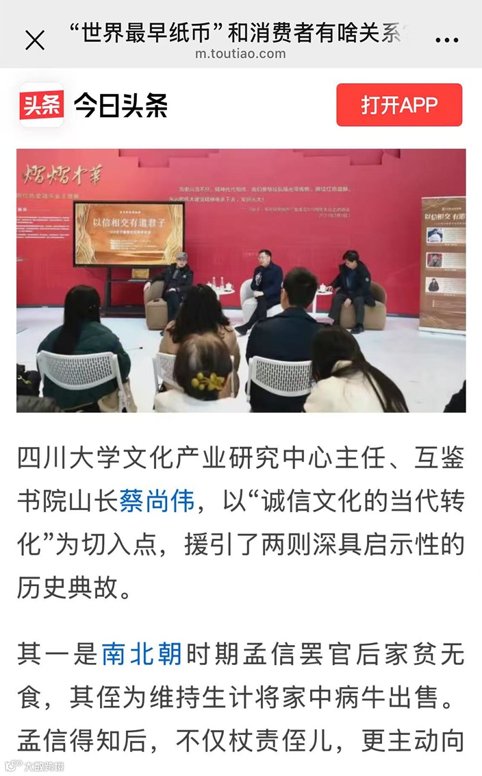 本次活动受到了川观新闻、红星新闻、中访网、今日头条、网易、新浪财经、凤凰财经等20余家主流媒体的广泛关注与报道。这跨越千年的学术对话,正是交子金控集团“诚信 创新 稳健 担当”企业文化核心价值观的生动演绎——从北宋交子铺的诚信烙印,到数字时代的创新基因;以稳健沉淀千年交子文化,用担当服务城市高质量发展。交子金融博物馆将继续以弘扬诚信精神为使命,通过多元活动推动传统文化与现代文明的对话。期待与您再次相聚,共同书写信用文明的新篇章!