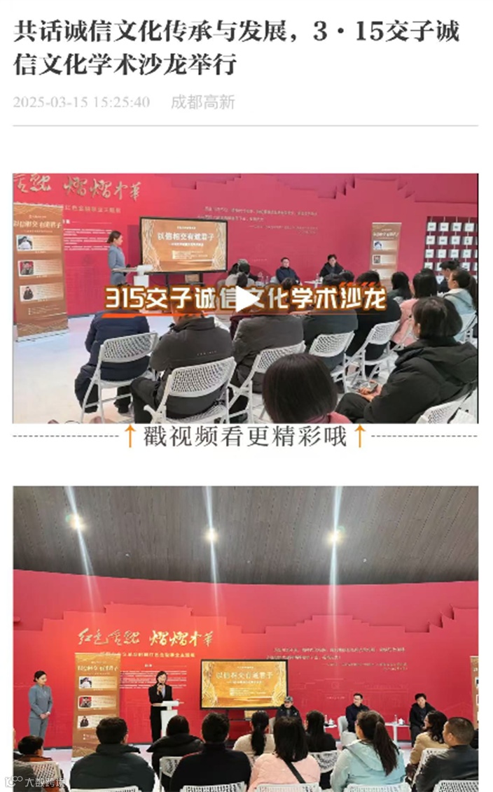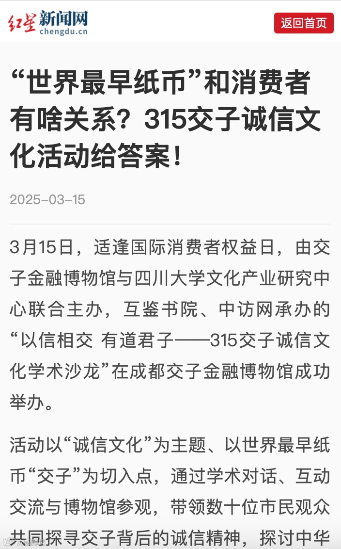 3月15日国际消费者权益日之际,由成都交子金控集团旗下交子金融博物馆与四川大学文化产业研究中心联合主办,互鉴书院、中访网承办的“以信相交 有道君子——315交子诚信文化学术沙龙”在交子金融博物馆成功举办。活动以世界最早纸币“交子”为切入点,通过学术对话、互动交流与展厅参观,带领市民观众共同探寻千年诚信文化的传承与现代意义,为消费者权益保护注入历史智慧。