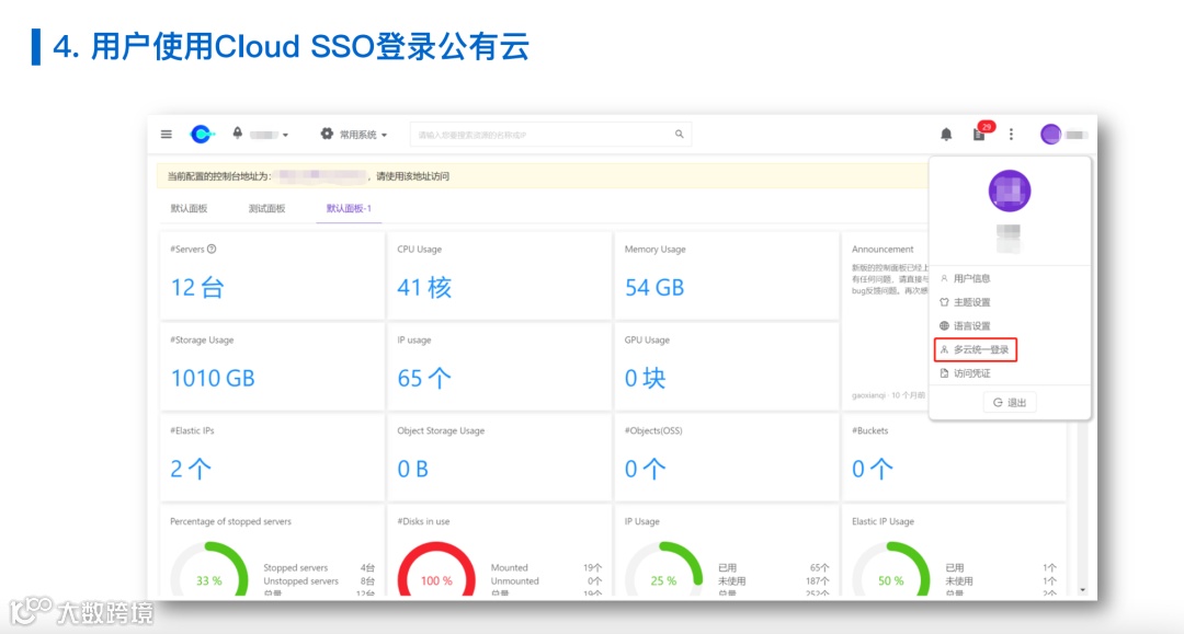 前面三步即为管理员需要的操作,第四步是用户的使用方法,用户需要登录到我们的平台,在右上角的个人信息的菜单中选择多云统一登录菜单。