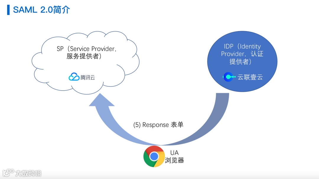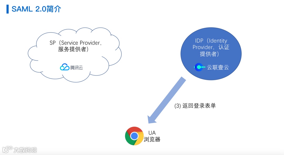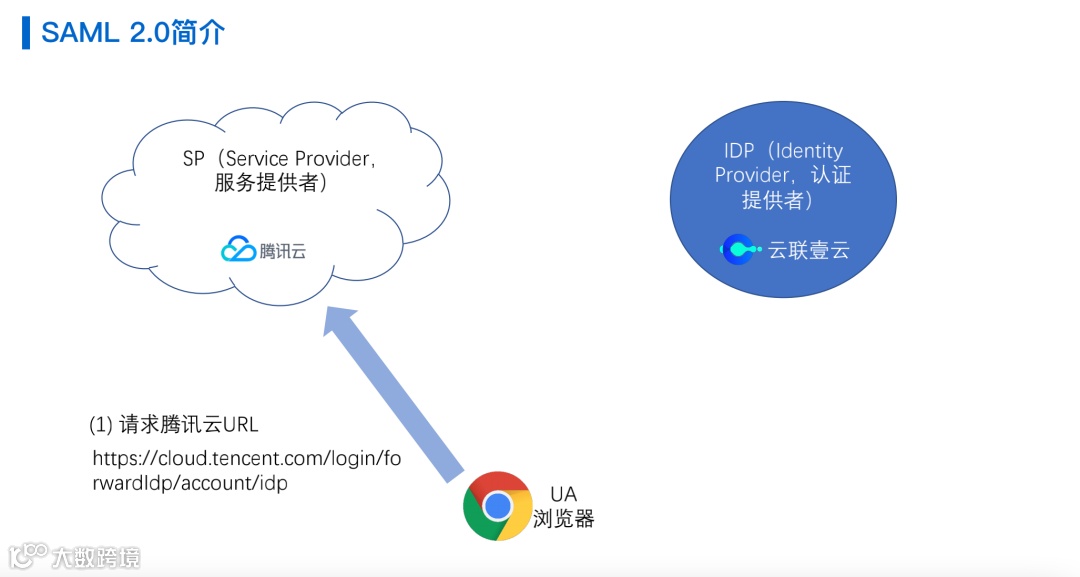 第三个是UA,其实就是浏览器,所以典型场景就是用户使用浏览器去访问Service provider,例如腾讯云的平台,然后需要有相应的认证信息,浏览器就会跳转到IDP,也就是云联壹云去认证用户,让认证用户认证通过之后再去跳转到相应的云平台去访问相应的服务。