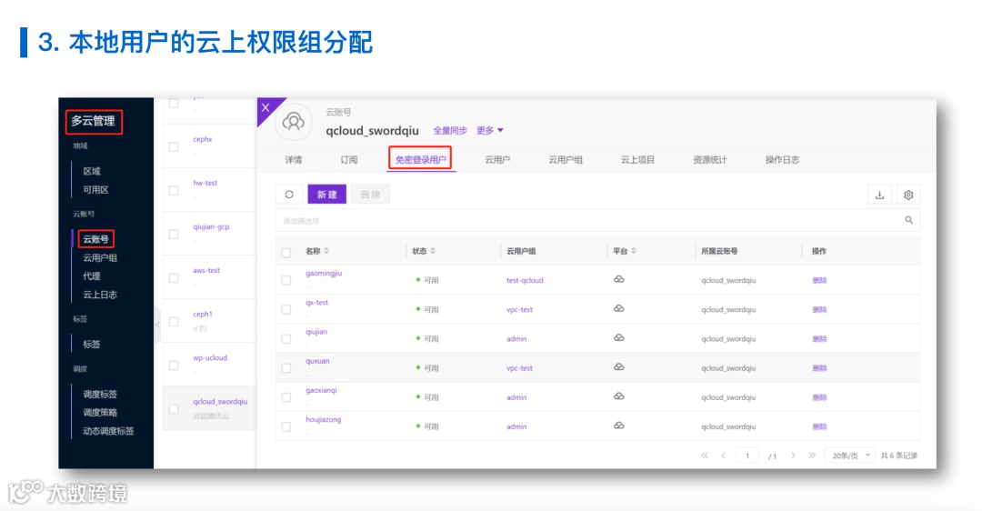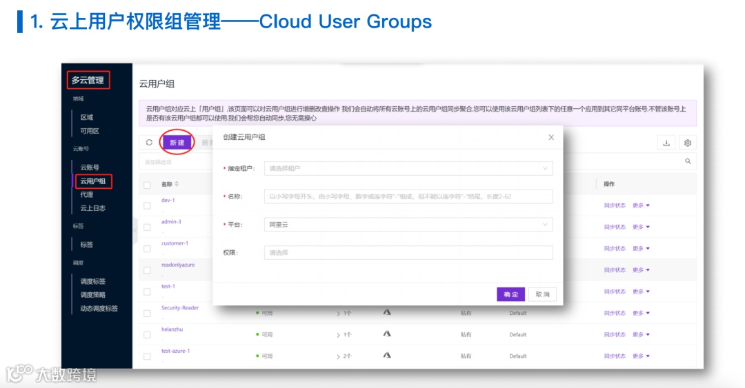 因此,我们会为每一个云的平台去定义相应的云用户组的定义,这个定义就定义好了用户在云上的权限的组合。