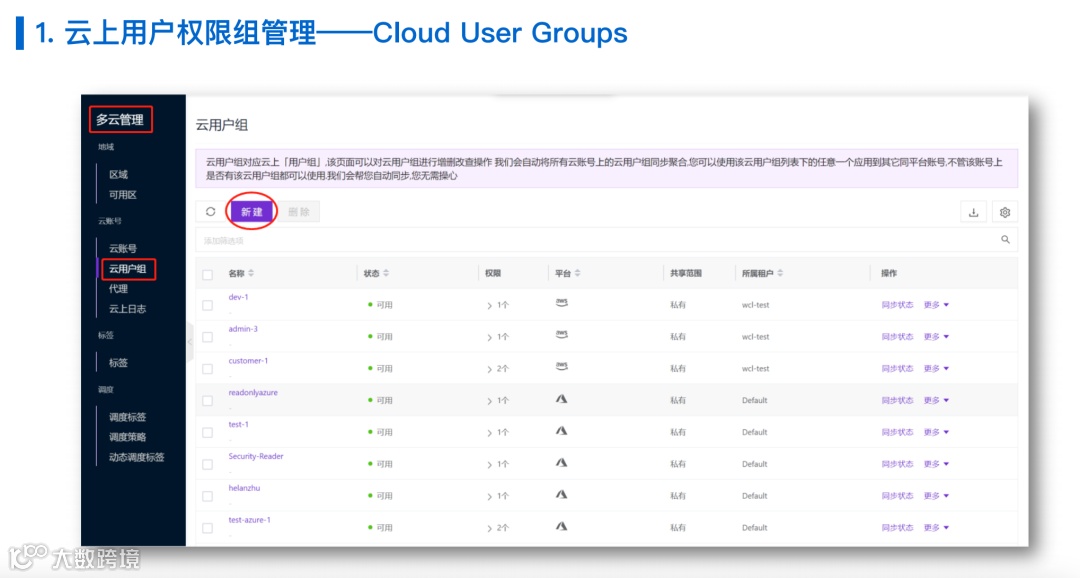 对于为什么会去针对每个云去定义不同的云的用户组,因为各个云的权限定义是非常不一样的。