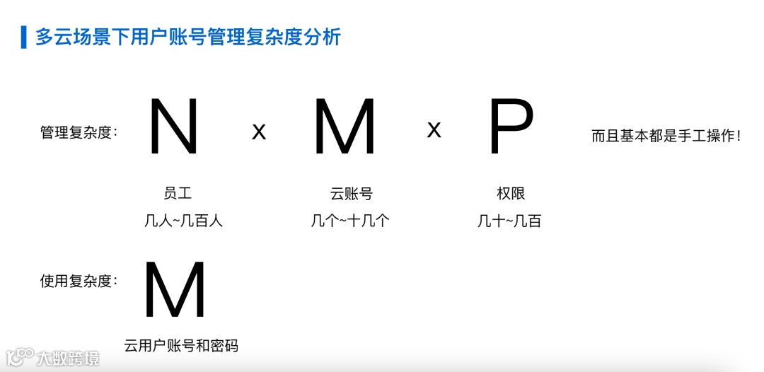 第一个维度,企业员工数量众多(N),账号管理员可能要为每个员工都要去开设云上账号,其次,该企业可能还会有若干个云账号(M),管理员为了去给员工在账号上开设权限,就必须登录到云账号上逐个开设,逐个登录并设置这些权限,而且每个云上的权限都非常复杂,有几十上百种权限组合(P)。