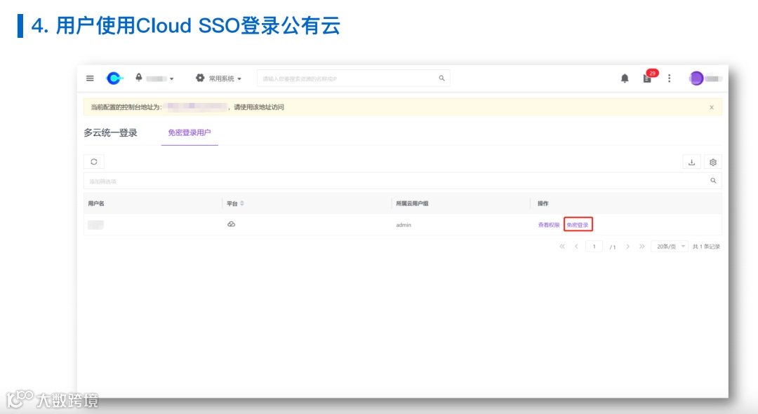 登录之后,可以看到管理员授予的能够登录的云账号以及相应权限,并且可以一键跳转,登录到相应的云平台去实现在云平台上相应的操作,所以不论是管理复杂度还是使用难度都大大降低。