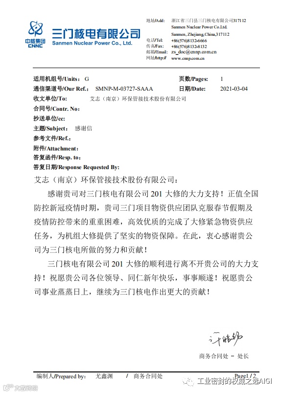 给艾志工业发来感谢信,感谢艾志工业在全国防控新冠疫情时期,克服春节假期及疫情防控带来的重重困难,高效优质的完成了大修紧急物资供应任务,为机组维修提供了坚实的物资保障!