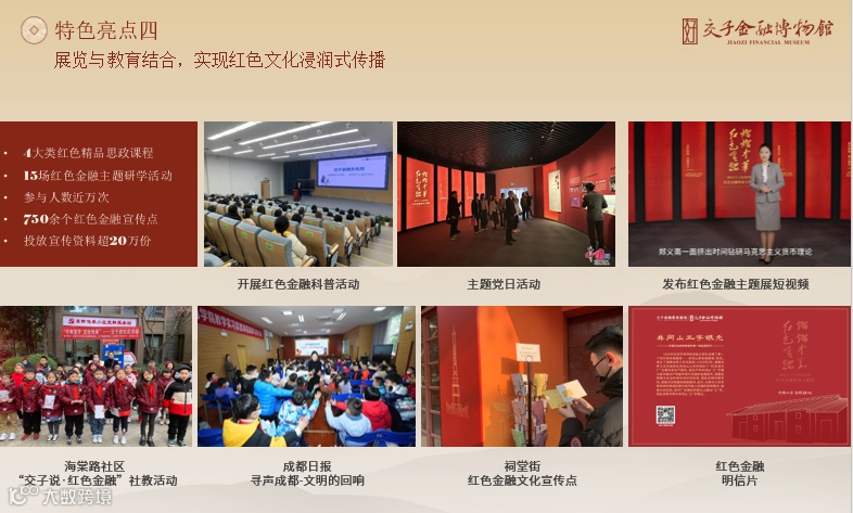 为纪念交子诞生千年、弘扬优秀金融文化、传承红色金融基因,交子金融博物馆依托临展厅策划举办了“红色金融 熠熠中华——新民主主义革命时期红色金融主题展”。1月9日,展览正式开幕。展览以我国红色金融事业发展历程为主线,围绕红色金融机构、红色货币发行、红色金融制度、红色金融故事4个维度,系统展现了大革命时期、土地革命战争时期、全民族抗日战争时期、解放战争时期4个历史阶段我国红色金融事业发展情况。旨在弘扬“诚实守信、以义取利、守正创新”的优秀传统文化,为交子的千年传承赋予新的时代内涵。