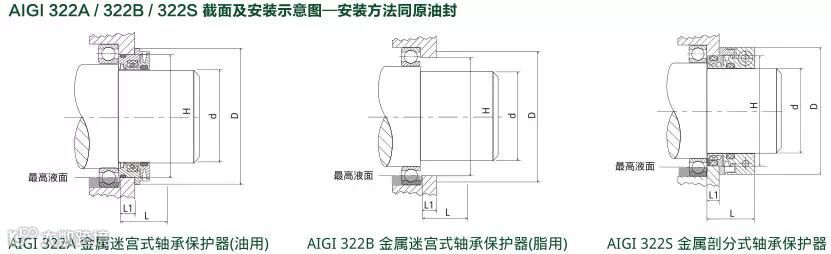 ● 取代传统迷宫油封;AIGI 322A/322B有辅助密封唇,AIGI 322S结构与材质升级,为剖分式安装结构