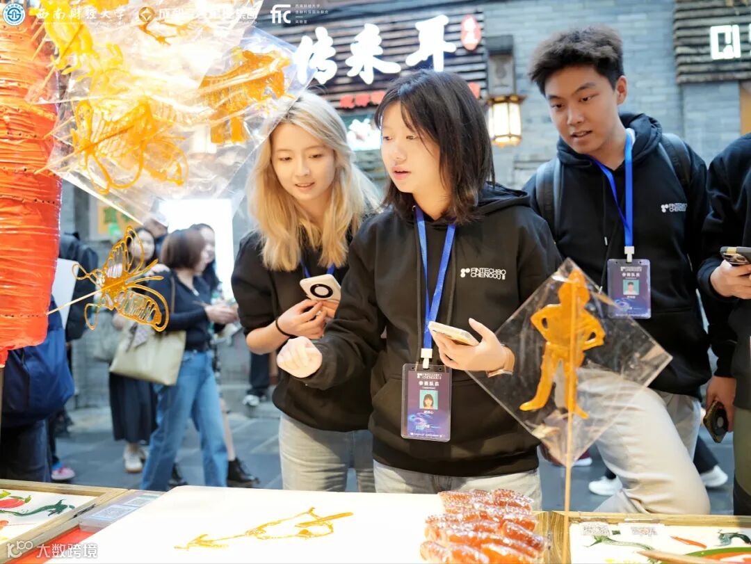 作为非物质文化遗产代表的糖画制作,也成为学子们轮流体验的重点项目,“以铜勺为笔、以糖液作墨”,不一会儿功夫,惟妙惟肖的糖化就展现在眼前,蜜饯般的糖化在舌尖上,美味在味蕾上徘徊,实属人间美味。来自加拿大女王大学的学子们现学现用,用糖画书写出“I LOVE 成都”,甜蜜中流淌着对成都满满的爱意。