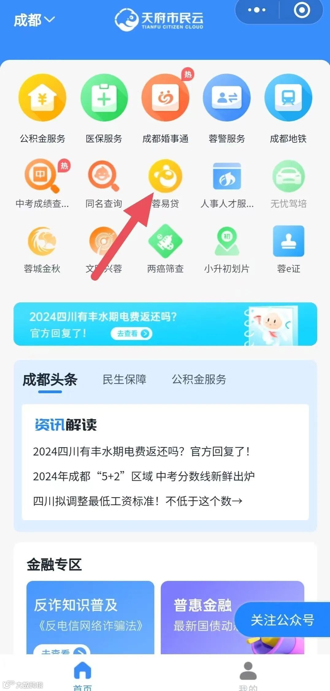 路径一:“蓉易贷” 平台在天府市民云、蓉易办新设了端口。打开天府市民云小程序,首页即可看到“蓉易贷”图标;打开蓉易办小程序,进入“企业服务菜单”,“蓉易贷”在那等您,快来体验吧!
