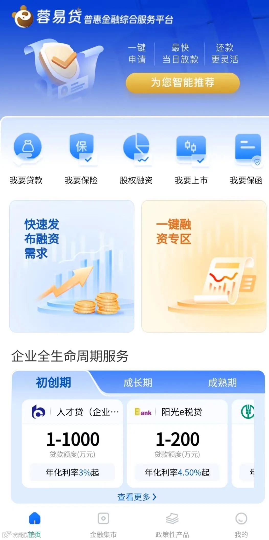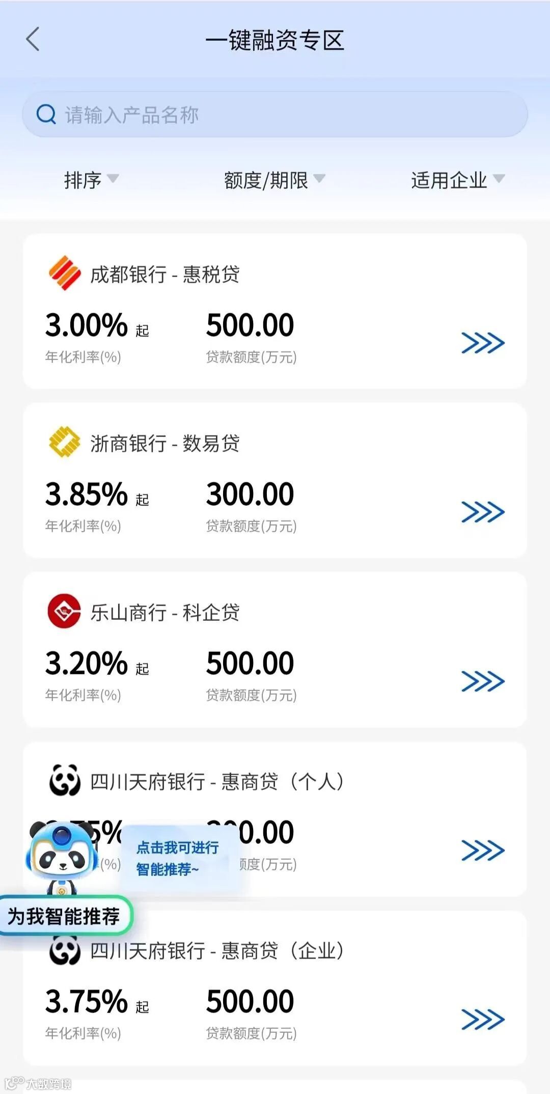 全:推出成都银行惠税贷、浙商银行数易贷、乐山商行科企贷、天府银行惠商贷、新网银行好业贷等首批一键融资产品,后续还有更多线上直连产品加入“一键融资”产品专区。