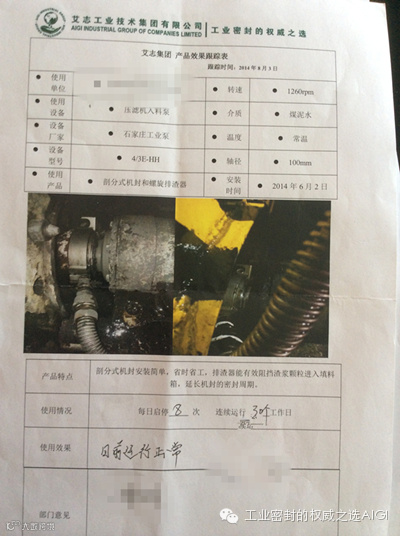 艾志工业442剖分式机封+螺旋排渣器在某洗煤厂使用,自6月2号起泵,连续3个月工作,其中A泵在8月底由于轴承损坏更换,拆卸泵和机封,动静环面完好,恢复泵后,接着使用;B泵,由于在加工填料箱端面时无法做到于轴的垂直度的保证,故有冲洗水滴漏。后续将连续跟踪。持续报道。