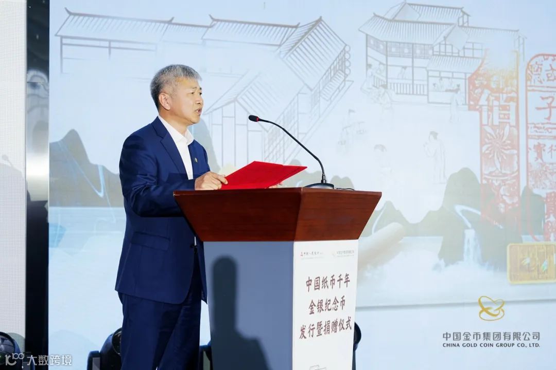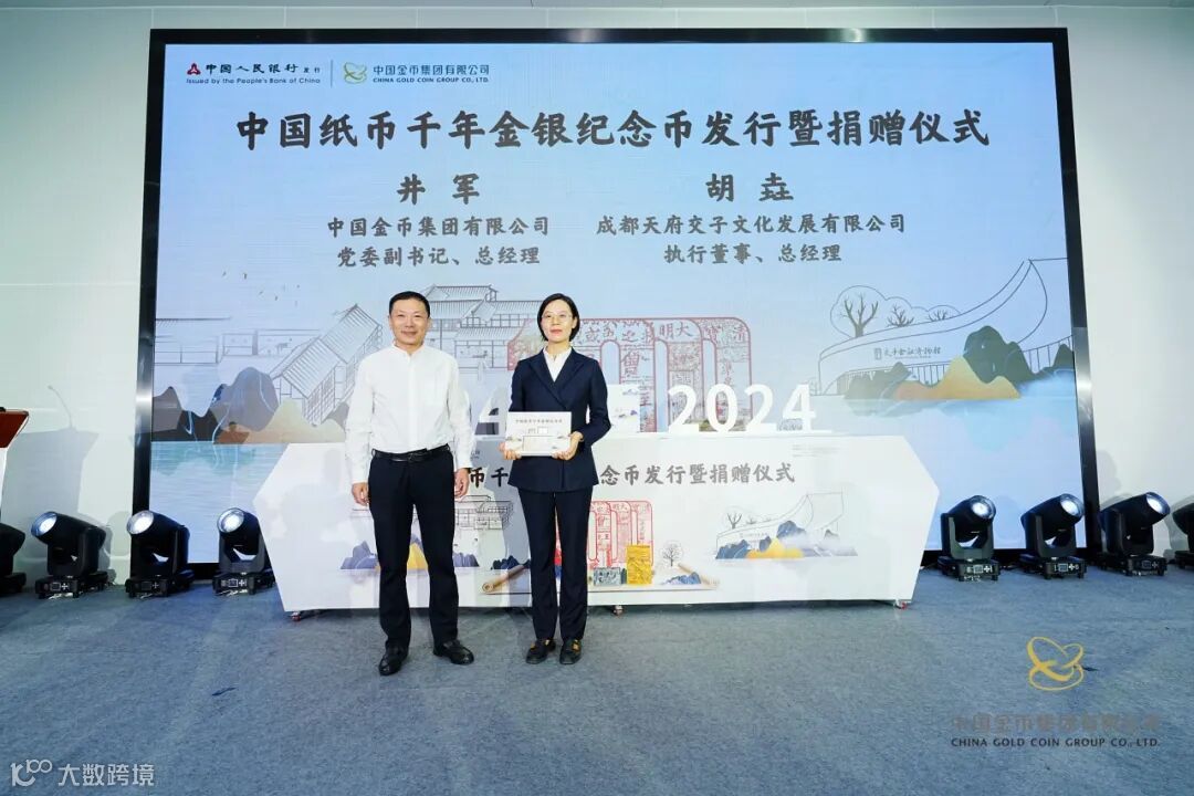 仪式上,中国金币集团总经理井军代表中国金币集团向交子金融博物馆捐赠一套编号为1024的中国纸币千年金银纪念币,交子金融博物馆负责人胡垚代表博物馆回赠了收藏证书。