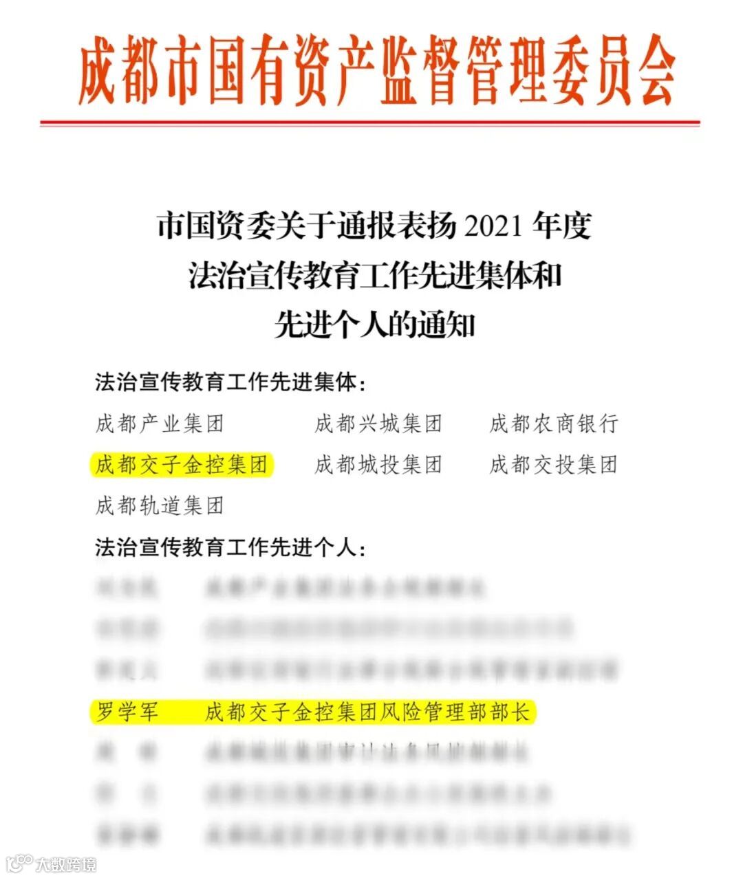 2022年1月29日, 成都交子金控集团收到市国资委通报表扬,被评选为“2021年度法治宣传教育工作先进集体”,集团风险管理部罗学军获得“法治宣传教育工作先进个人”。这是2020年以来,集团再次获得该项殊荣。