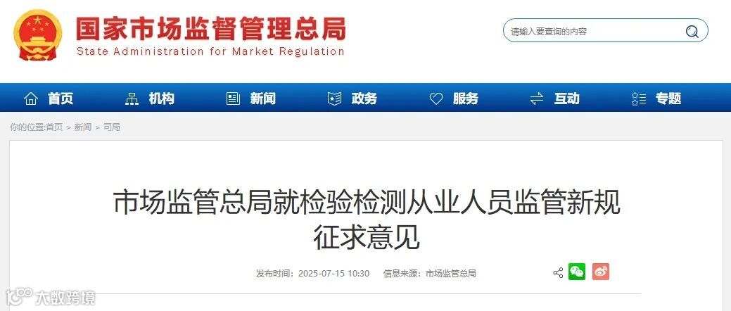 近日,市场监管总局研究起草《检验检测从业人员监督管理办法(试行)(征求意见稿)》(以下简称《办法》),面向市场监管系统征求意见。该《办法》聚焦检验检测行业“人”这一核心要素,旨在加强对检验检测机构及其从业人员的监督管理,规范从业人员行为,健全检验检测行业诚信体系,进一步释放对检验检测活动从严监管的信号,推动责任落实到人,提升行业治理水平。
