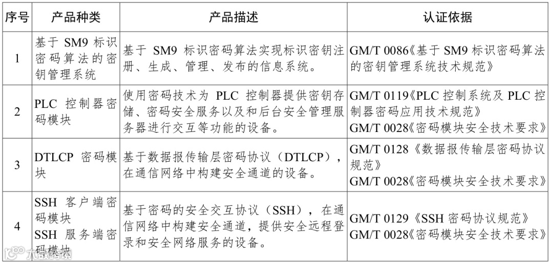 1. 上述产品中的密码算法应为符合GM/T 0001《祖冲之序列密码算法》、GM/T 0002《SM4分组密码算法》、GM/T 0003《SM2椭圆曲线公钥密码算法》、GM/T 0004《SM3密码杂凑算法》、GM/T 0009《SM2密码算法使用规范》、GM/T 0010《SM2密码算法加密签名消息语法规范》、GM/T 0044《SM9标识密码算法》等国家密码管理要求的密码算法。