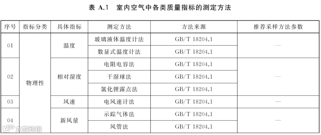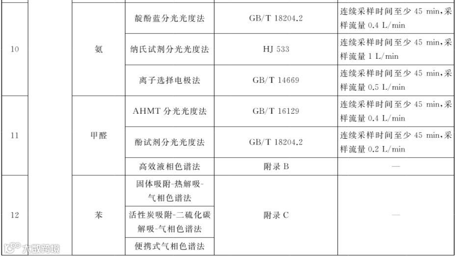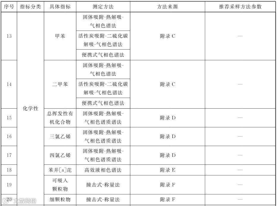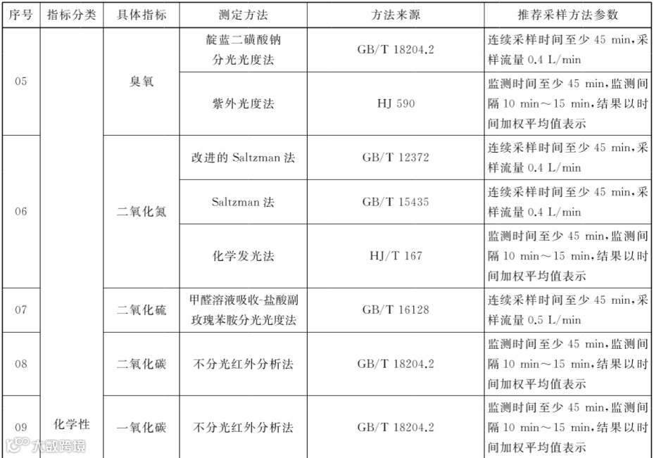 2、修改了温度、相对湿度、风速、新风量、臭氧、二氧化氮、二氧化硫、二氧化碳、一氧化碳、氨、甲醛等11项指标的测定方法和方法来源,增加了三氯乙烯、四氯乙烯和细颗粒物的测定方法和方法来源,增加了推荐采样方法参数,详见下图。