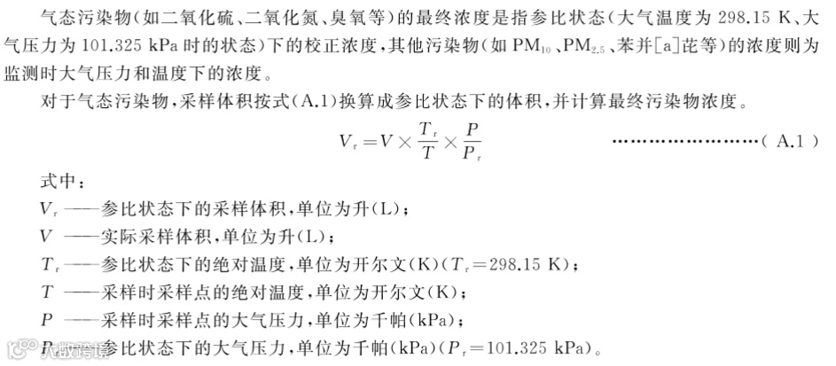 3、修改了污染物浓度换算方式。GB/T 18883-2002中,在计算浓度时应将采样体积换算成标准状态下的体积。GB/T 18883-2022中,气态污染物的最终浓度是指参比状态下的校正浓度,其他污染物的浓度则为监测时大气压力和温度下的浓度,详见下图。