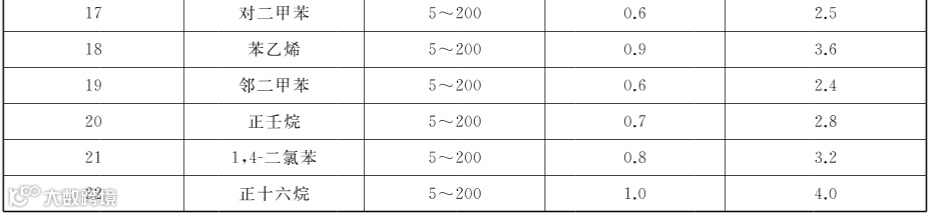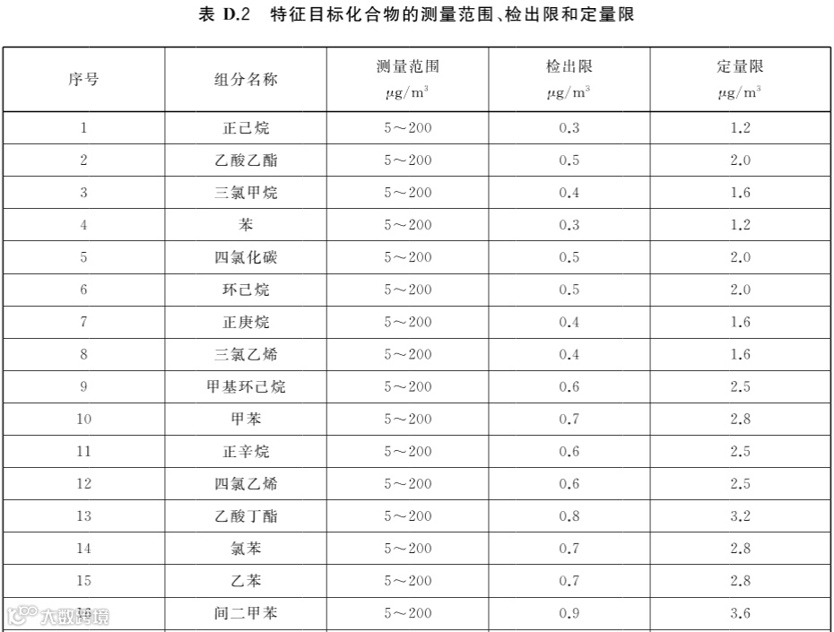 修改了苯、TVOC、细菌总数等3项指标的测定方法(见附录C、附录D、附录G)。需要注意的是,新的TVOC测定方法中,TVOC标准储备溶液中包含22种特征目标化合物,详见下图。