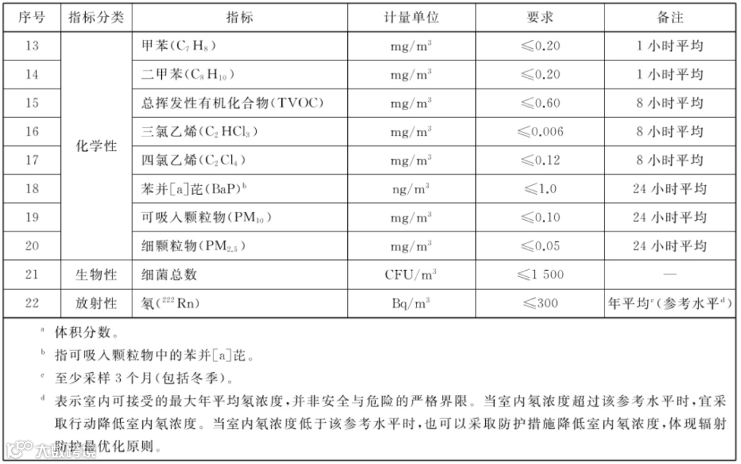 2、调整了5项化学性指标(二氧化氮、二氧化碳、甲醛、苯、可吸入颗粒物)、1项生物性指标(细菌总数)和1项放射性指标(氡)要求。(注:二氧化碳限值虽未调整,但是要求由“日平均值”修改为“1h平均值”,其他指标均有收严。)