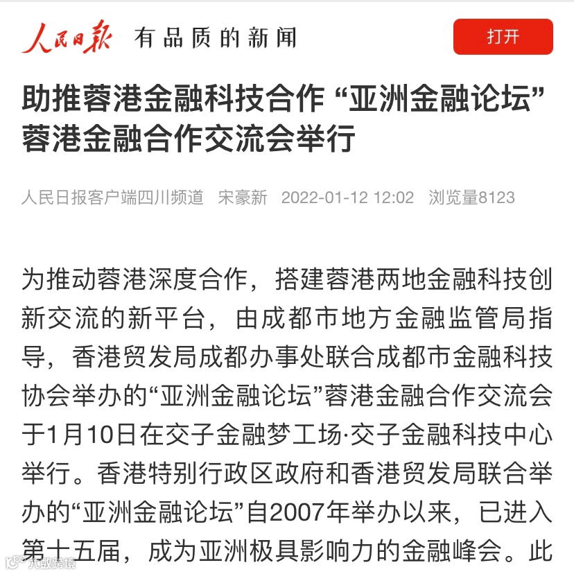 为推动蓉港深度合作,搭建蓉港两地金融科技创新交流的新平台,由成都市地方金融监管局指导,香港贸发局成都办事处联合成都市金融科技协会举办的“亚洲金融论坛”蓉港金融合作交流会于1月10日在交子金融梦工场·交子金融科技中心举行。香港特别行政区政府和香港贸发局联合举办的“亚洲金融论坛”自2007年举办以来,已进入第十五届,成为亚洲极具影响力的金融峰会。