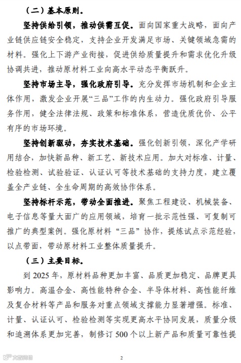 近日,四部门联合印发《原材料工业“三品”实施方案》,提出到2025年,原材料品种更加丰富、品质更加稳定、品牌更具影响力。标准、计量、认证认可、检验检测等实现更高水平协同发展,质量分级和追溯体系更加完善,制修订500个以上新产品和质量可靠性提升类标准,全面推动关键基础材料全生命周期标准体系建设。到2035年,原材料品种供给能力和水平、服务质量大幅提升,达到世界先进国家水平,形成一批质量卓越、优势明显、拥有核心知识产权的企业和产品品牌。
